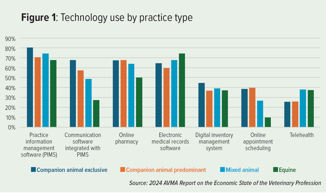 Technology adoption rates also vary by practice type. For example, PIMS integrated communications software and online appointment scheduling are more common in companion animal practice than in mixed animal or equine practice.1 (Figure 1)